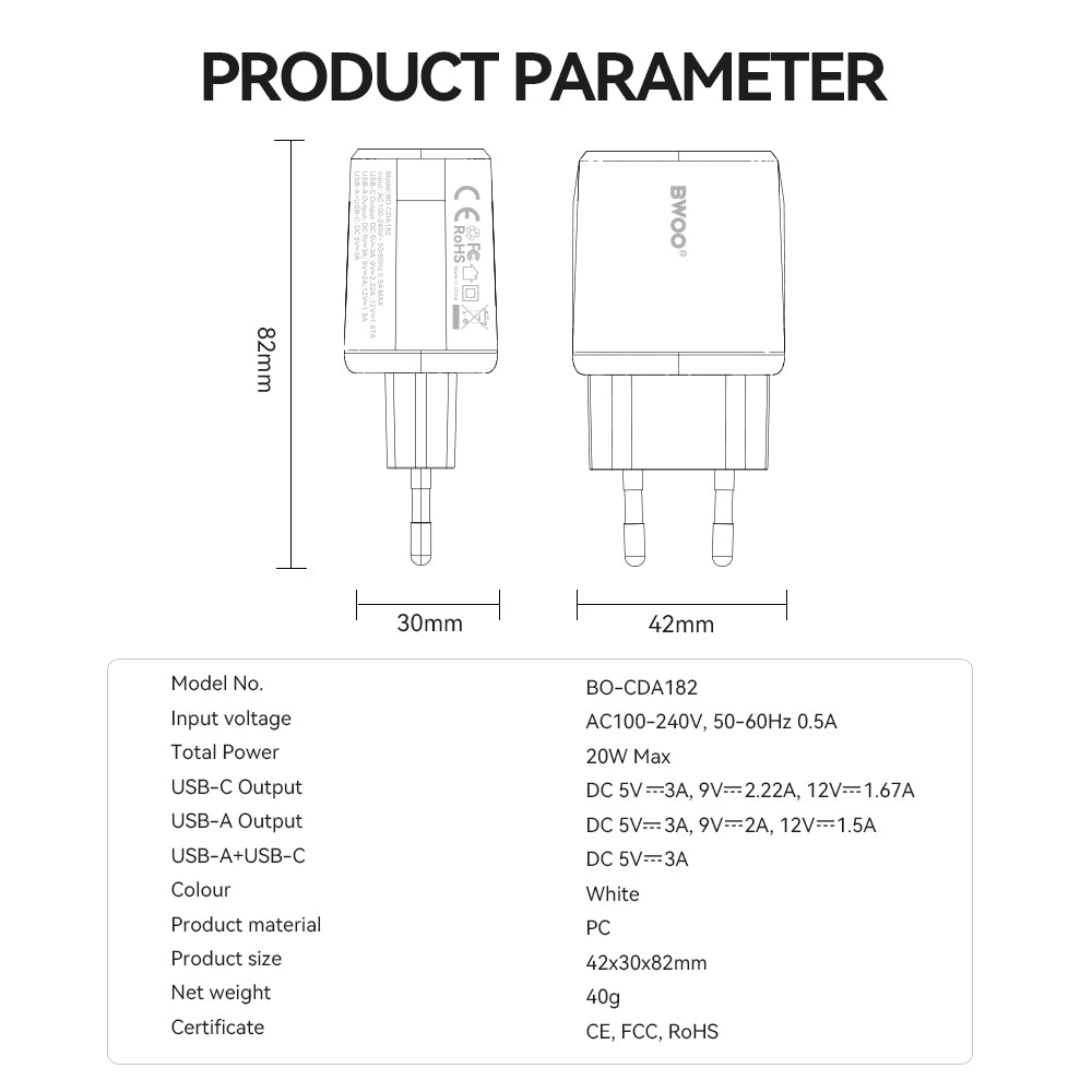 The BWOO CDA182 network charger is equipped with two ports, USB-C and USB-A, providing the necessary flexibility to simultaneously power two devices