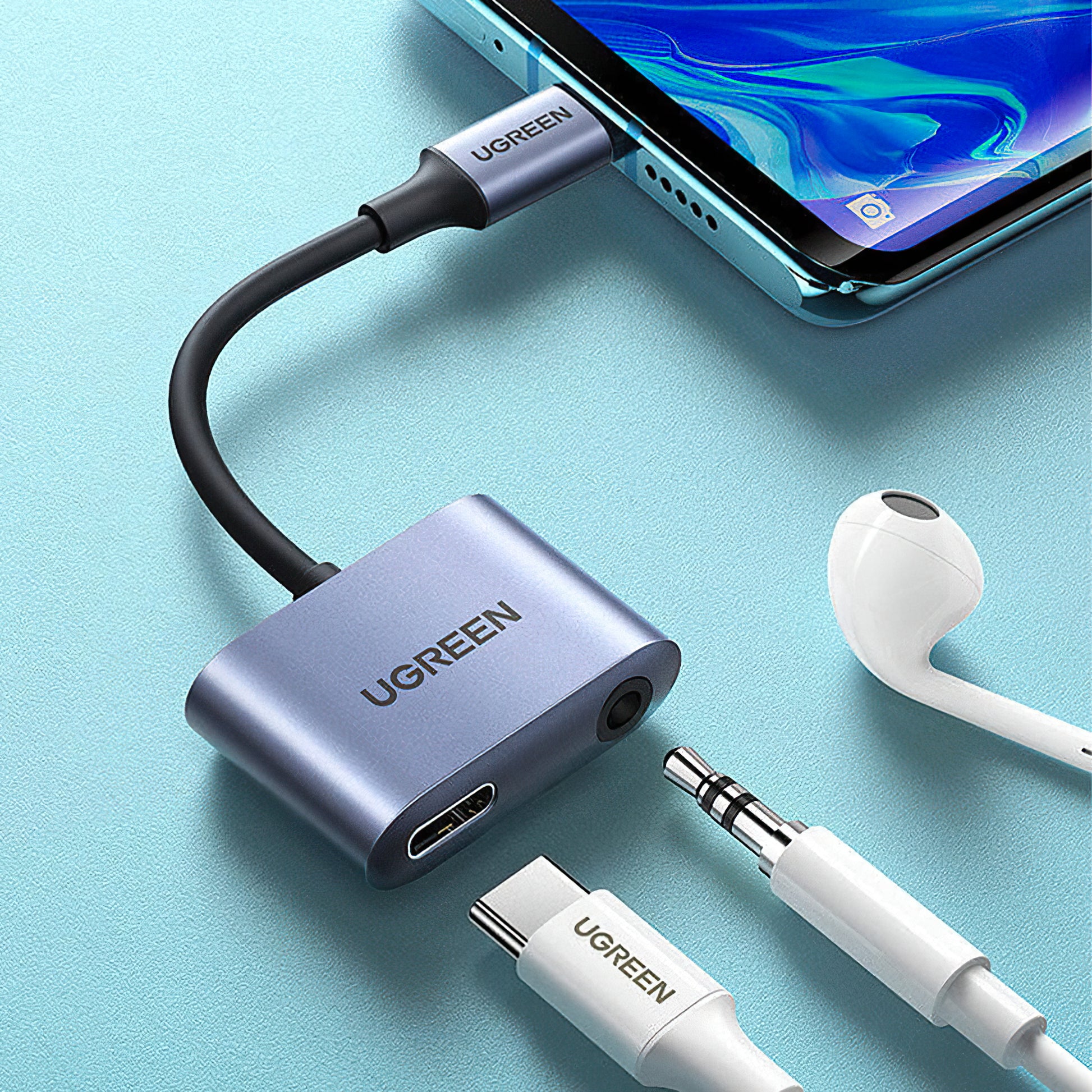L'adattatore audio USB-C a 3.5mm / USB-C UGREEN CM231 ti permette di ascoltare musica e caricare il telefono simultaneamente.