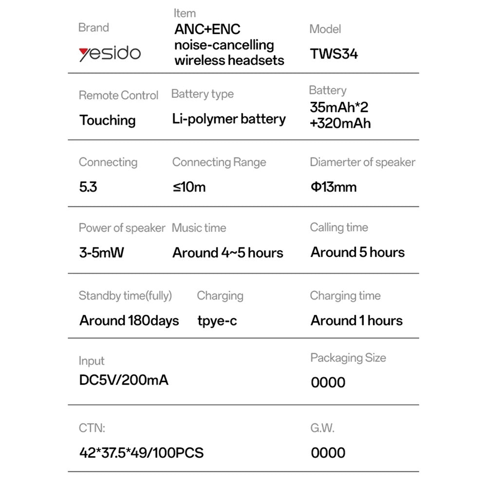 Auricolare Bluetooth Yesido TWS34, TWS, ANC, Bianco