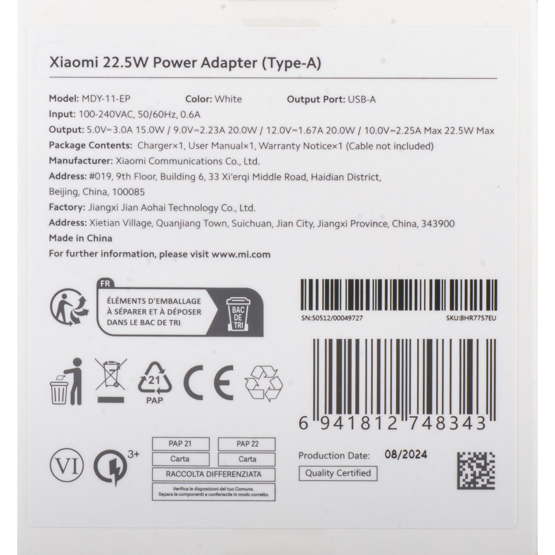 | Uscita | USB-A (5V / 3A / 9V / 2.23A / 12V / 1.67A / 10V / 2.25A) |
