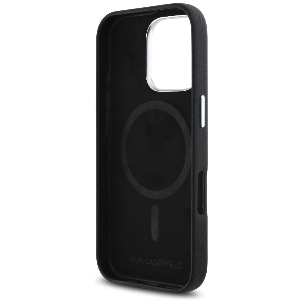 Custodia MagSafe per Apple iPhone 16 Pro Max, Karl Lagerfeld, Saffiano Full Wrapped Elongated Metal Logo, Nera
